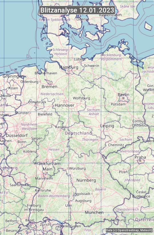 Die Blitzübersicht zeigt alle registrierten Blitze am 12.01.2023. Sie basiert auf dem Blitzortungssystem Blids der Firma Siemens.