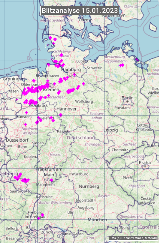 Die Blitzübersicht zeigt alle registrierten Blitze am 15.01.2023. Sie basiert auf dem Blitzortungssystem Blids der Firma Siemens.