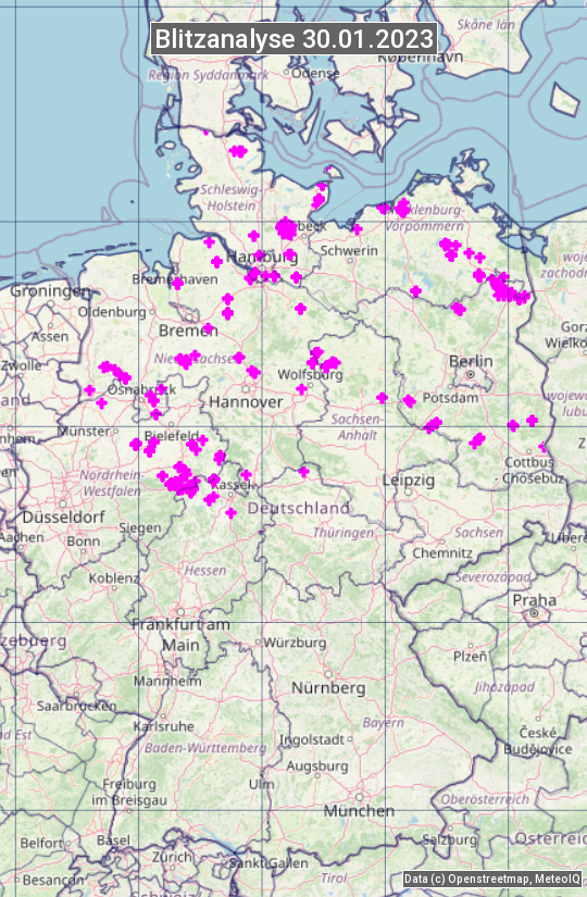 Die Blitzübersicht zeigt alle registrierten Blitze am 30.01.2023. Sie basiert auf dem Blitzortungssystem Blids der Firma Siemens.
