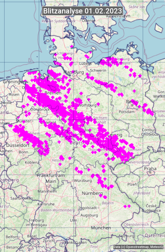 Die Blitzübersicht zeigt alle registrierten Blitze am 01.02.2023. Sie basiert auf dem Blitzortungssystem Blids der Firma Siemens.