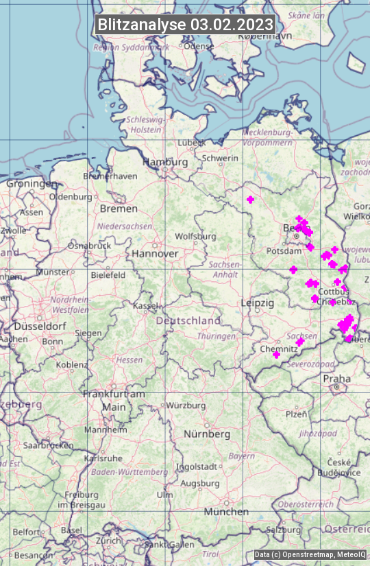 Die Blitzübersicht zeigt alle registrierten Blitze am 03.02.2023. Sie basiert auf dem Blitzortungssystem Blids der Firma Siemens.