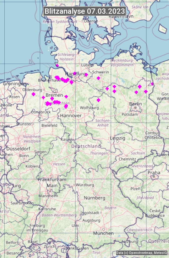 Die Blitzübersicht zeigt alle registrierten Blitze am 07.03.2023. Sie basiert auf dem Blitzortungssystem Blids der Firma Siemens.