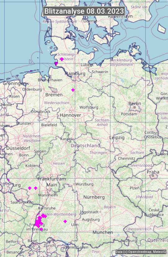 Die Blitzübersicht zeigt alle registrierten Blitze am 08.03.2023. Sie basiert auf dem Blitzortungssystem Blids der Firma Siemens.