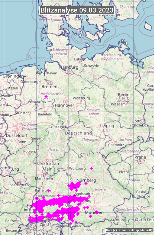 Die Blitzübersicht zeigt alle registrierten Blitze am 09.03.2023. Sie basiert auf dem Blitzortungssystem Blids der Firma Siemens.