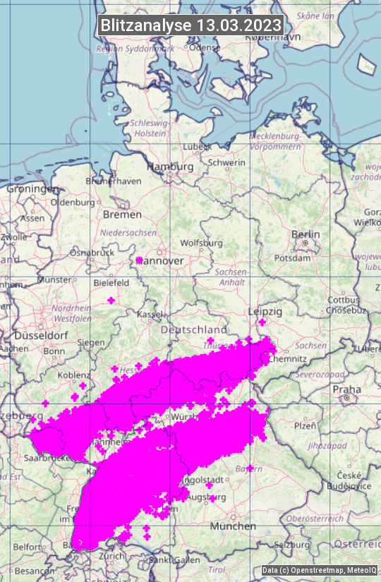 Die Blitzübersicht zeigt alle registrierten Blitze am 13.03.2023. Sie basiert auf dem Blitzortungssystem Blids der Firma Siemens.