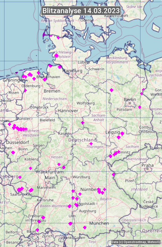 Die Blitzübersicht zeigt alle registrierten Blitze am 14.03.2023. Sie basiert auf dem Blitzortungssystem Blids der Firma Siemens.