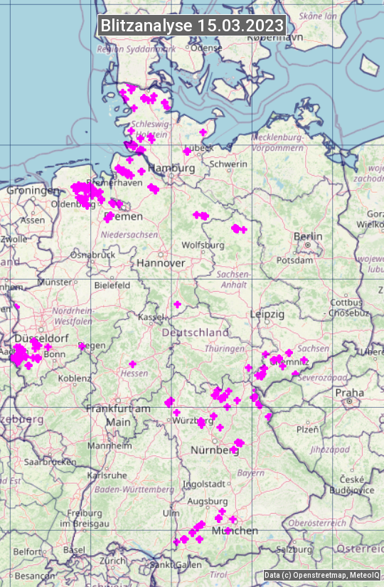 Die Blitzübersicht zeigt alle registrierten Blitze am 15.03.2023. Sie basiert auf dem Blitzortungssystem Blids der Firma Siemens.