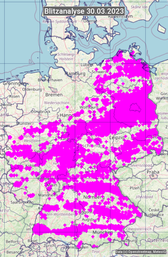 Die Blitzübersicht zeigt alle registrierten Blitze am 30.03.2023. Sie basiert auf dem Blitzortungssystem Blids der Firma Siemens.