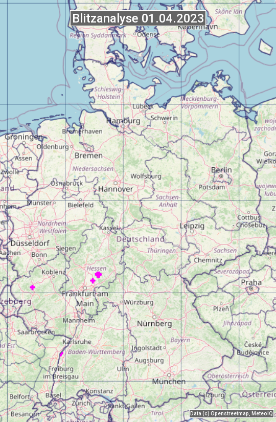 Die Blitzübersicht zeigt alle registrierten Blitze am 01.04.2023. Sie basiert auf dem Blitzortungssystem Blids der Firma Siemens.
