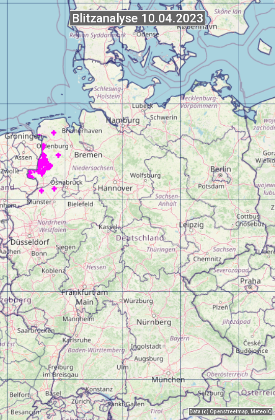 Die Blitzübersicht zeigt alle registrierten Blitze am 10.04.2023. Sie basiert auf dem Blitzortungssystem Blids der Firma Siemens.