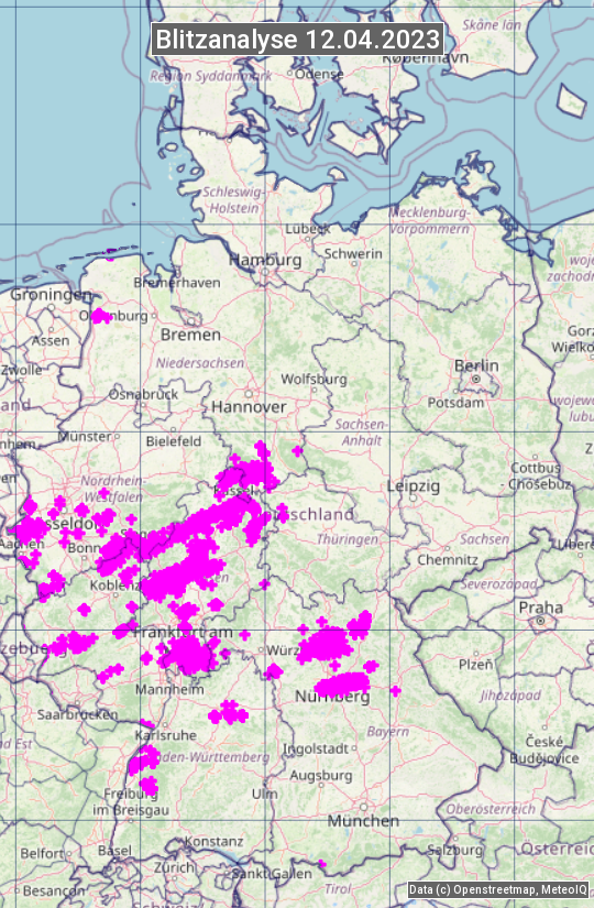 Die Blitzübersicht zeigt alle registrierten Blitze am 12.04.2023. Sie basiert auf dem Blitzortungssystem Blids der Firma Siemens.