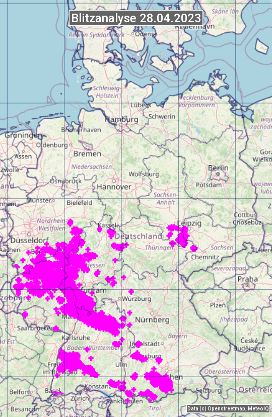 Die Blitzübersicht zeigt alle registrierten Blitze am 28.04.2023. Sie basiert auf dem Blitzortungssystem Blids der Firma Siemens.