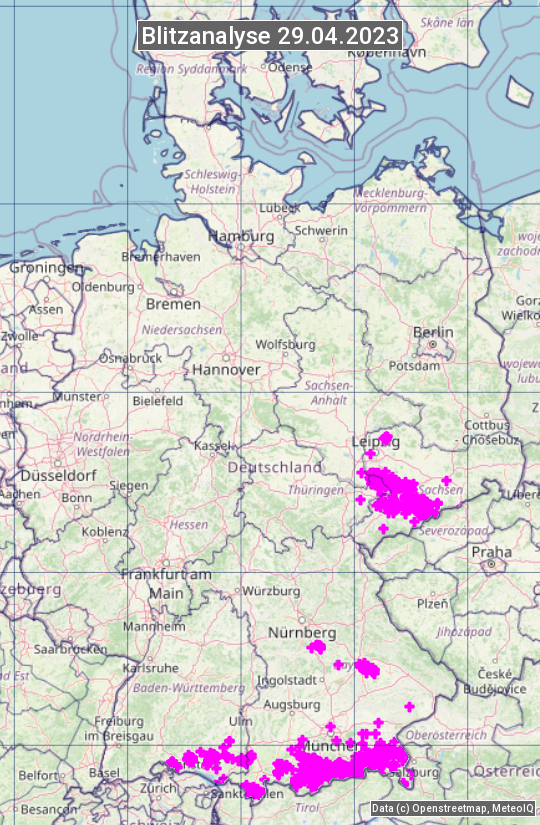 Die Blitzübersicht zeigt alle registrierten Blitze am 29.04.2023. Sie basiert auf dem Blitzortungssystem Blids der Firma Siemens.