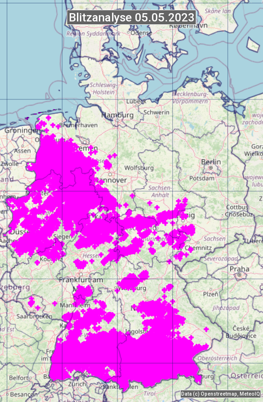 Die Blitzübersicht zeigt alle registrierten Blitze am 05.05.2023. Sie basiert auf dem Blitzortungssystem Blids der Firma Siemens.