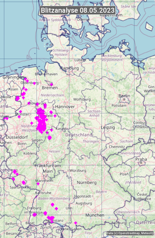 Die Blitzübersicht zeigt alle registrierten Blitze am 08.05.2023. Sie basiert auf dem Blitzortungssystem Blids der Firma Siemens.