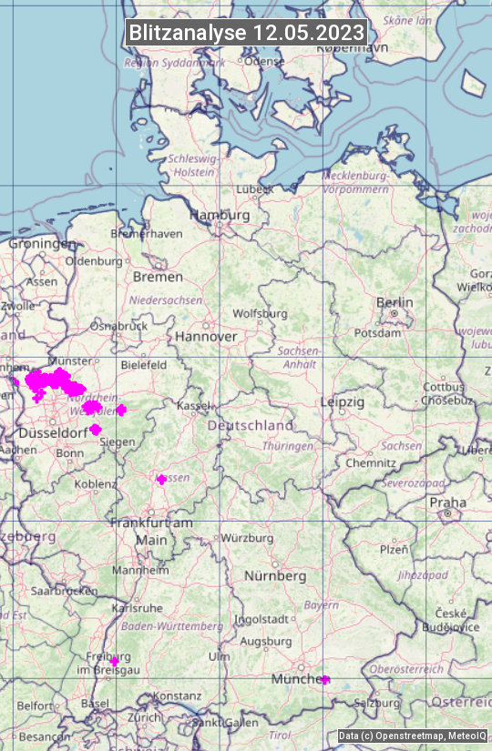 Die Blitzübersicht zeigt alle registrierten Blitze am 12.05.2023. Sie basiert auf dem Blitzortungssystem Blids der Firma Siemens.