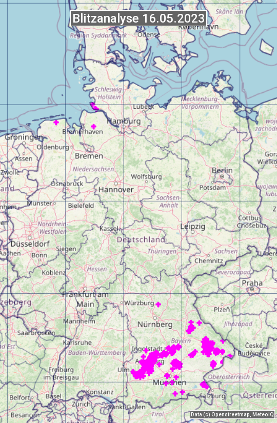 Die Blitzübersicht zeigt alle registrierten Blitze am 16.05.2023. Sie basiert auf dem Blitzortungssystem Blids der Firma Siemens.