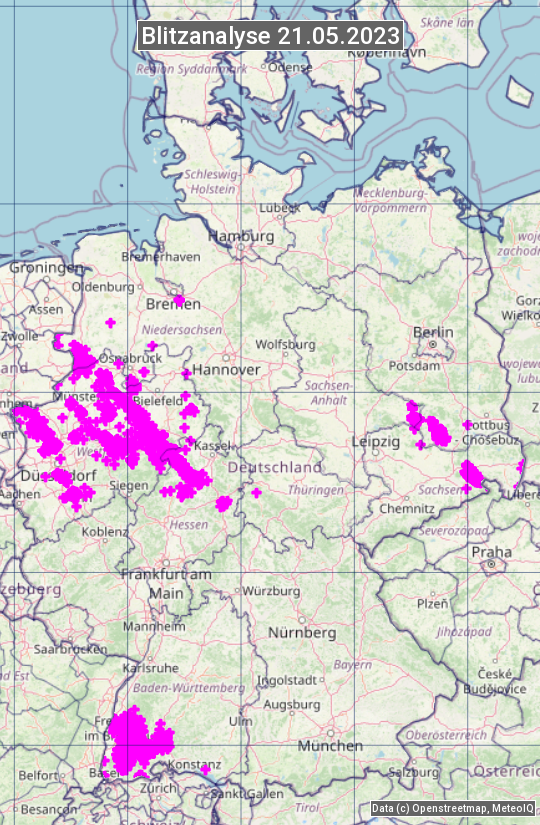Die Blitzübersicht zeigt alle registrierten Blitze am 21.05.2023. Sie basiert auf dem Blitzortungssystem Blids der Firma Siemens.