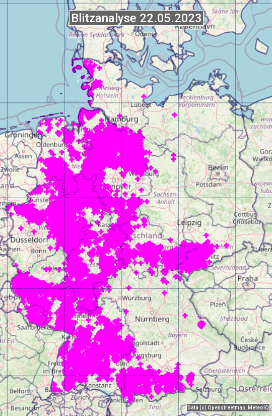 Die Blitzübersicht zeigt alle registrierten Blitze am 22.05.2023. Sie basiert auf dem Blitzortungssystem Blids der Firma Siemens.