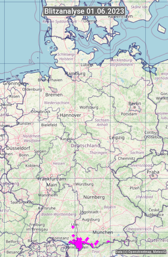 Die Blitzübersicht zeigt alle registrierten Blitze am 01.06.2023. Sie basiert auf dem Blitzortungssystem Blids der Firma Siemens.