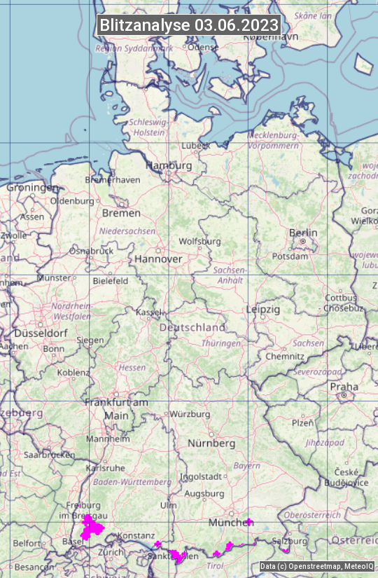 Die Blitzübersicht zeigt alle registrierten Blitze am 03.06.2023. Sie basiert auf dem Blitzortungssystem Blids der Firma Siemens.