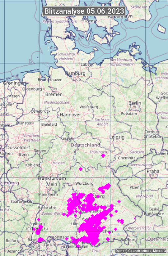 Die Blitzübersicht zeigt alle registrierten Blitze am 05.06.2023. Sie basiert auf dem Blitzortungssystem Blids der Firma Siemens.