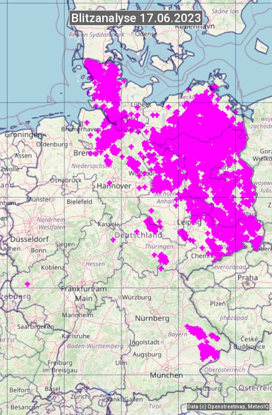 Die Blitzübersicht zeigt alle registrierten Blitze am 17.06.2023. Sie basiert auf dem Blitzortungssystem Blids der Firma Siemens.