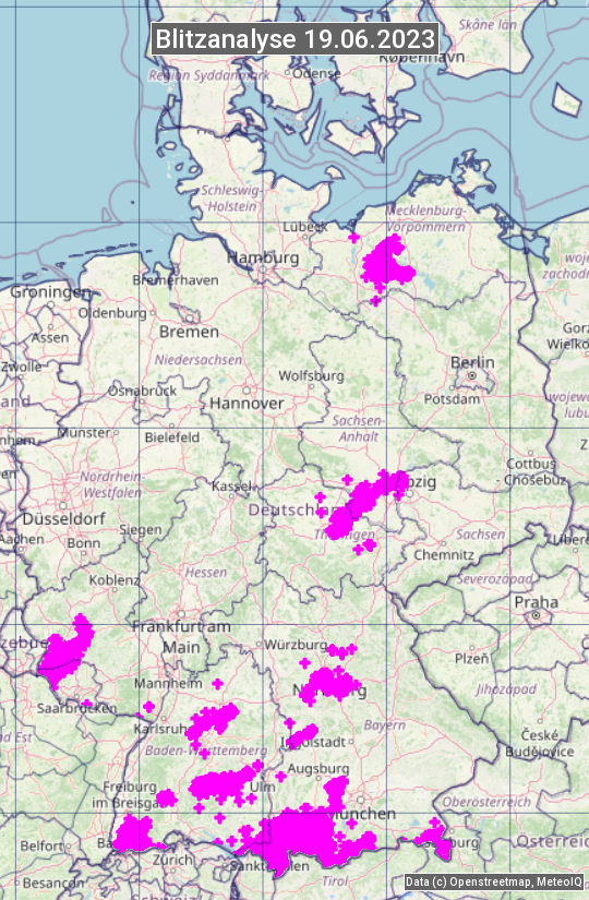 Die Blitzübersicht zeigt alle registrierten Blitze am 19.06.2023. Sie basiert auf dem Blitzortungssystem Blids der Firma Siemens.