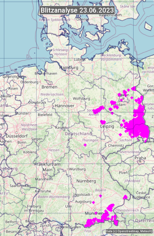 Die Blitzübersicht zeigt alle registrierten Blitze am 23.06.2023. Sie basiert auf dem Blitzortungssystem Blids der Firma Siemens.