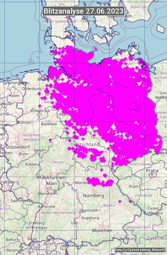 Die Blitzübersicht zeigt alle registrierten Blitze am 27.06.2023. Sie basiert auf dem Blitzortungssystem Blids der Firma Siemens.