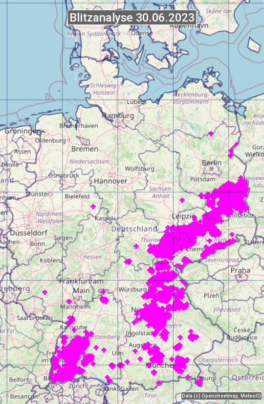Die Blitzübersicht zeigt alle registrierten Blitze am 30.06.2023. Sie basiert auf dem Blitzortungssystem Blids der Firma Siemens.