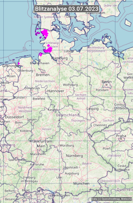 Die Blitzübersicht zeigt alle registrierten Blitze am 03.07.2023. Sie basiert auf dem Blitzortungssystem Blids der Firma Siemens.