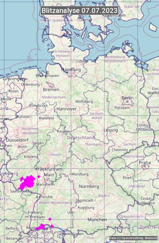 Die Blitzübersicht zeigt alle registrierten Blitze am 07.07.2023. Sie basiert auf dem Blitzortungssystem Blids der Firma Siemens.