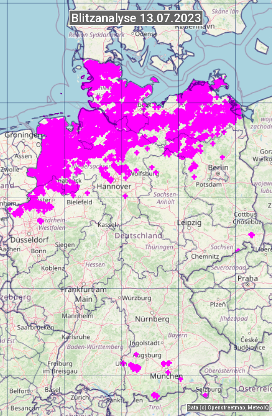 Die Blitzübersicht zeigt alle registrierten Blitze am 13.07.2023. Sie basiert auf dem Blitzortungssystem Blids der Firma Siemens.