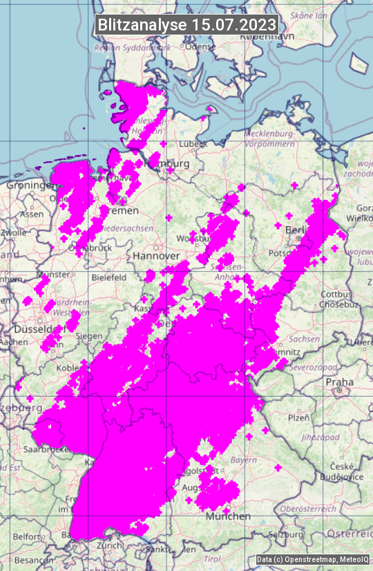 Die Blitzübersicht zeigt alle registrierten Blitze am 15.07.2023. Sie basiert auf dem Blitzortungssystem Blids der Firma Siemens.