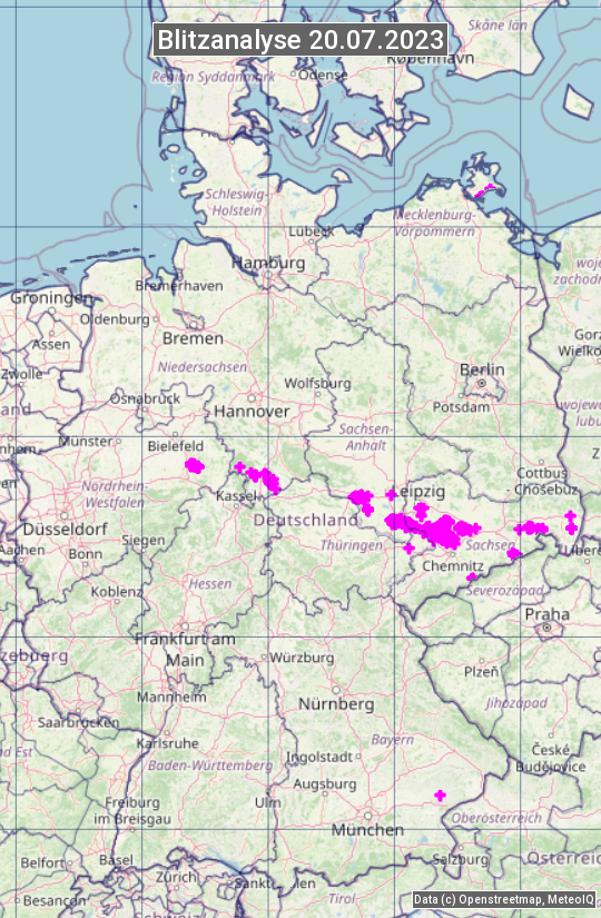 Die Blitzübersicht zeigt alle registrierten Blitze am 20.07.2023. Sie basiert auf dem Blitzortungssystem Blids der Firma Siemens.