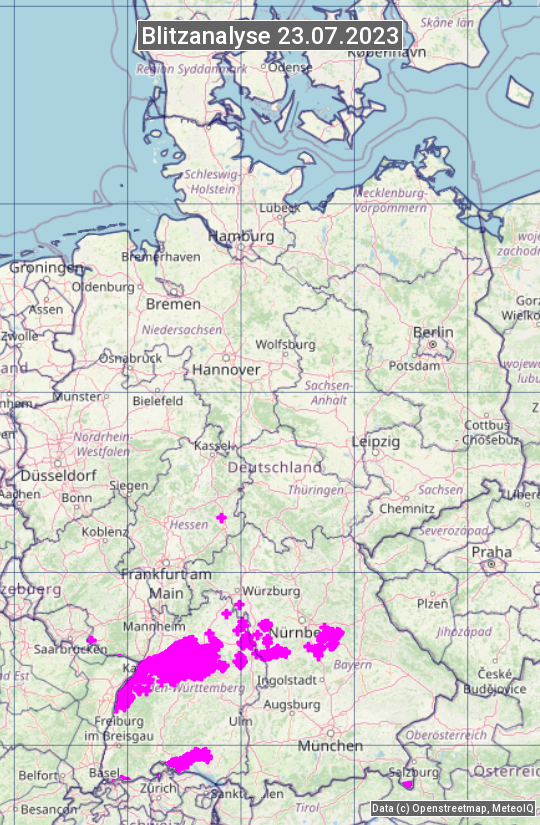 Die Blitzübersicht zeigt alle registrierten Blitze am 23.07.2023. Sie basiert auf dem Blitzortungssystem Blids der Firma Siemens.