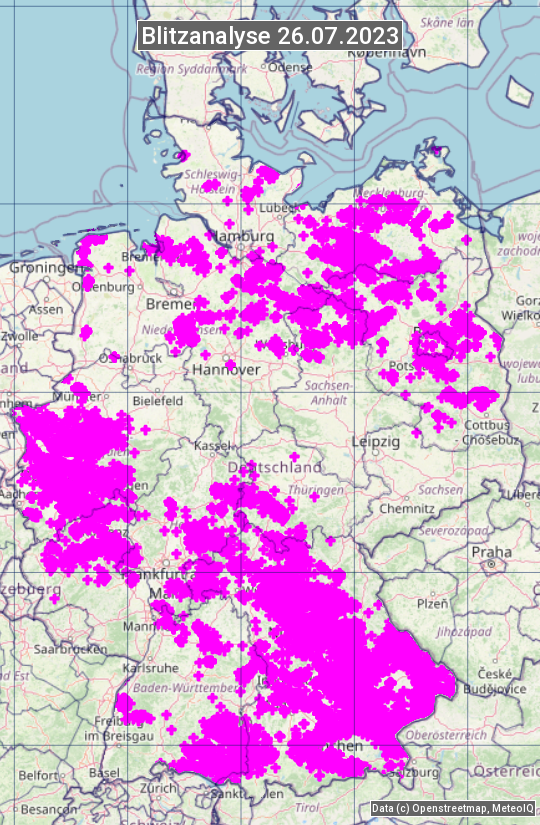 Die Blitzübersicht zeigt alle registrierten Blitze am 26.07.2023. Sie basiert auf dem Blitzortungssystem Blids der Firma Siemens.