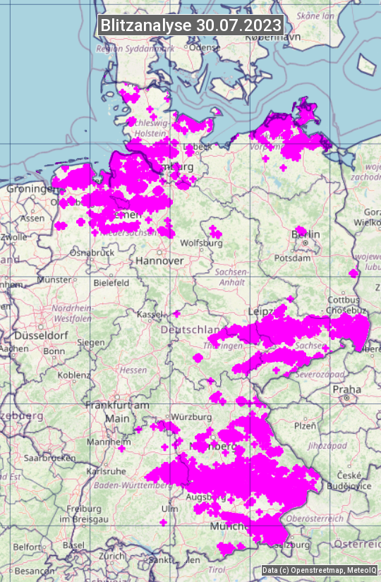 Die Blitzübersicht zeigt alle registrierten Blitze am 30.07.2023. Sie basiert auf dem Blitzortungssystem Blids der Firma Siemens.