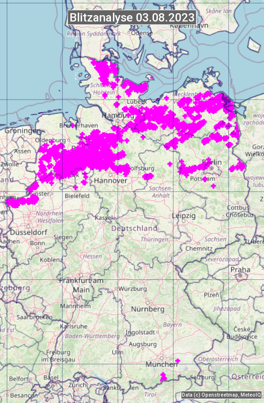 Die Blitzübersicht zeigt alle registrierten Blitze am 03.08.2023. Sie basiert auf dem Blitzortungssystem Blids der Firma Siemens.