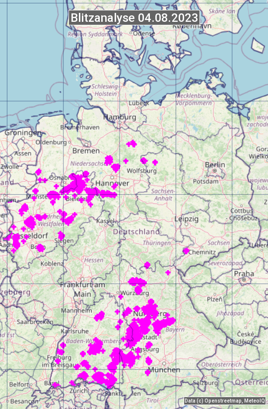 Die Blitzübersicht zeigt alle registrierten Blitze am 04.08.2023. Sie basiert auf dem Blitzortungssystem Blids der Firma Siemens.