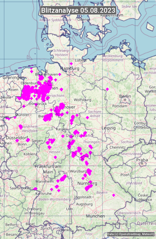 Die Blitzübersicht zeigt alle registrierten Blitze am 05.08.2023. Sie basiert auf dem Blitzortungssystem Blids der Firma Siemens.