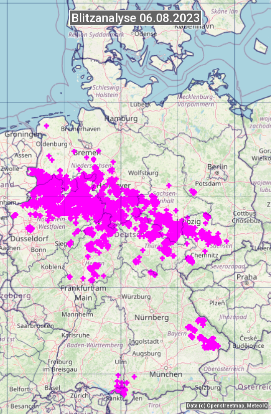 Die Blitzübersicht zeigt alle registrierten Blitze am 06.08.2023. Sie basiert auf dem Blitzortungssystem Blids der Firma Siemens.