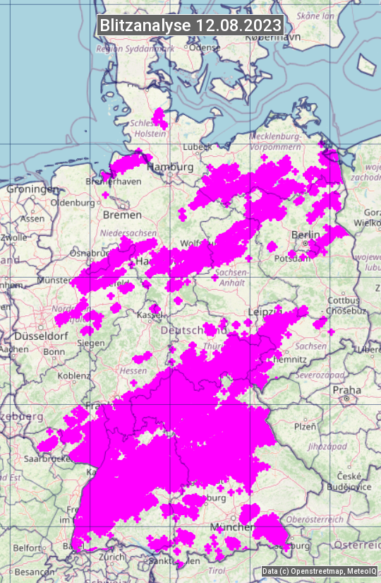 Die Blitzübersicht zeigt alle registrierten Blitze am 12.08.2023. Sie basiert auf dem Blitzortungssystem Blids der Firma Siemens.