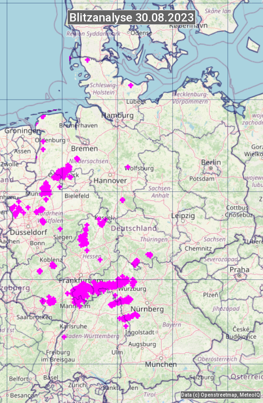 Die Blitzübersicht zeigt alle registrierten Blitze am 30.08.2023. Sie basiert auf dem Blitzortungssystem Blids der Firma Siemens.