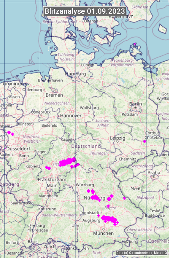 Die Blitzübersicht zeigt alle registrierten Blitze am 01.09.2023. Sie basiert auf dem Blitzortungssystem Blids der Firma Siemens.