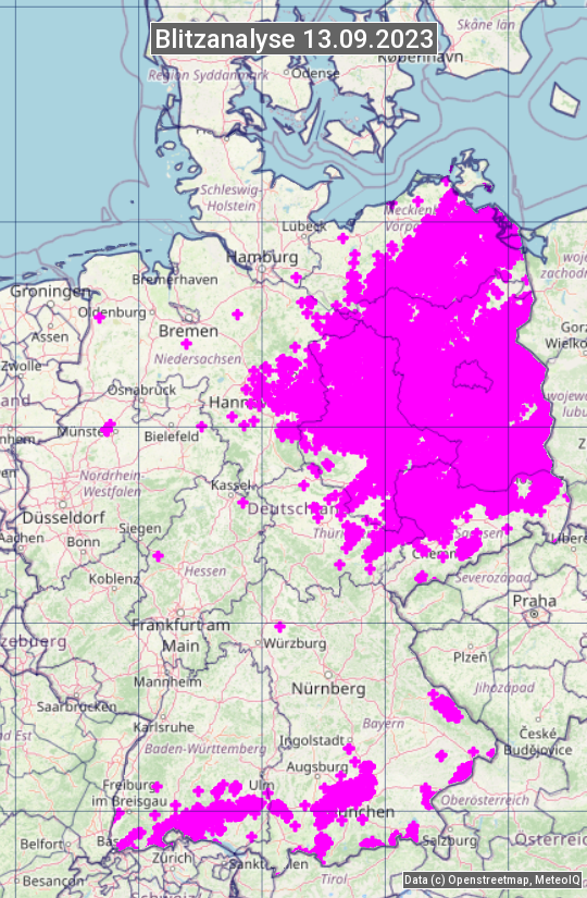 Die Blitzübersicht zeigt alle registrierten Blitze am 13.09.2023. Sie basiert auf dem Blitzortungssystem Blids der Firma Siemens.