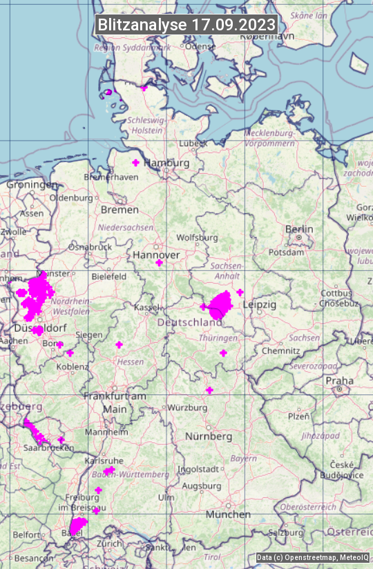 Die Blitzübersicht zeigt alle registrierten Blitze am 17.09.2023. Sie basiert auf dem Blitzortungssystem Blids der Firma Siemens.