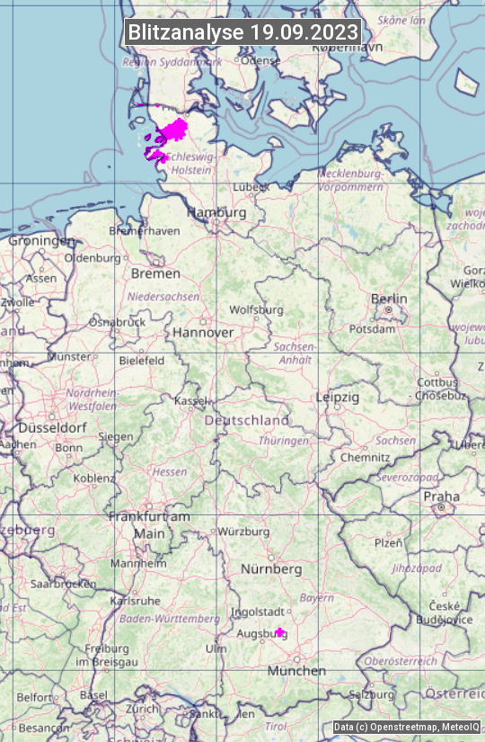 Die Blitzübersicht zeigt alle registrierten Blitze am 19.09.2023. Sie basiert auf dem Blitzortungssystem Blids der Firma Siemens.