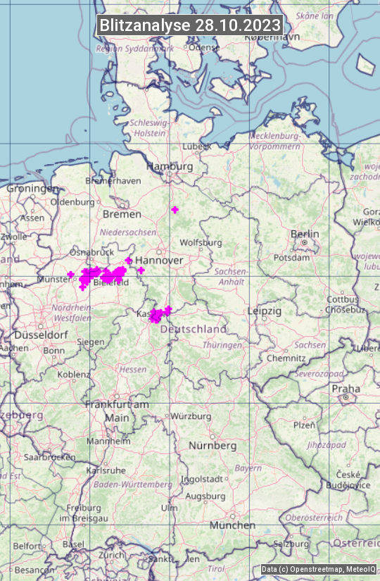 Die Blitzübersicht zeigt alle registrierten Blitze am 28.10.2023. Sie basiert auf dem Blitzortungssystem Blids der Firma Siemens.